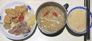 羊肉烧豆腐圆子,酸汤葛根粉,小米粥。