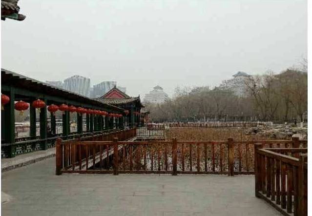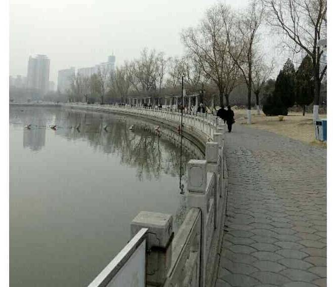 有人带着口罩在快步走;一位女士,看样子五十岁左右,坐在湖边的长椅上抽烟。如此重污染的天气,不知是不是运用的以毒攻毒的原理;东北角一拨人在唱歌;南边的一座亭子里一人在吹萨克斯。